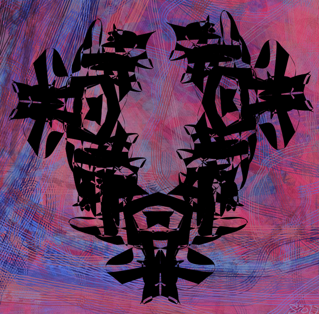 Wir fangen an dieser Stelle an. Der "Bullenkopf" in schwarz ist vermutlich aus gefülltem Gekritzel entstanden. Zu dieser Zeit tauchte ich häufig in komplett schwarz getauchte Kunstwerke ein. Ich erinnere mich nicht genau, ob ich zu diesem Zeitpunkt bereits mit der Deckkraft (Opacity) spielte, als ich die gefüllten Elemente zusammenlegte.